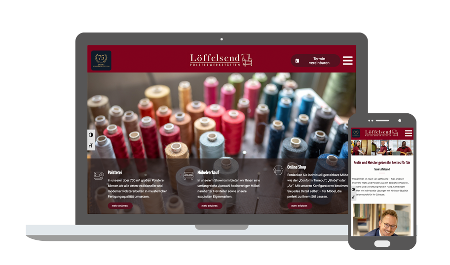 Umfangreicher Relaunch der Firmenwebsite. Mit großen Bildern und zum Teil neuen Texten werden die handwerklichen Fähigkeiten der Mitarbeitenden der Firma Löffelsend in neues Licht gerückt. Das Traditionsunternehmen ist der Anlaufpunkt für alle Aufträge rund um Polster, Möbel und Stoffe.
